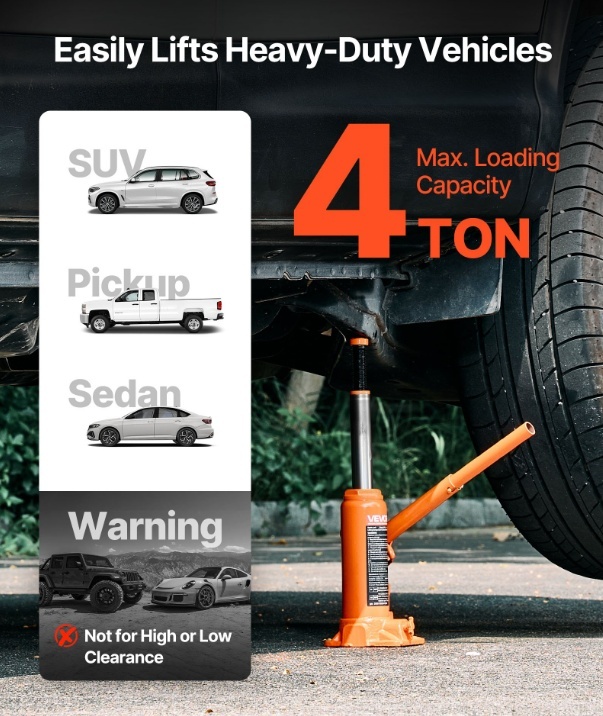 Stabils pacelšanas mehānisms: Mūsu hidrauliskais domkrats var pacelt līdz 4 tonnām (8818,4 mārciņām), kas ir lieliski piemērots sedaniem, maziem pikapiem un apvidus auto. Tas darbojas arī ar lauksaimniecības instrumentiem un kompaktām mašīnām. Drošai pacelšanai izvēlieties 4 tonnu domkratu, ja jūsu transportlīdzeklis sver 2,5 tonnas vai mazāk.
