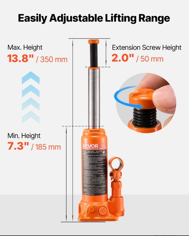 Plašs pacelšanas diapazons: No zema līdz augstam, šim augstās pacelšanas domkratam ir viss nepieciešamais. Tas paceļ no 185 mm līdz 350 mm, ar 50 mm skrūvi augstuma precīzai regulēšanai — ērti, ja vieta ir ierobežota.