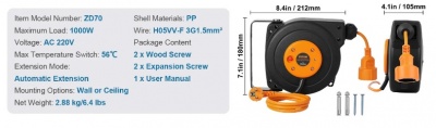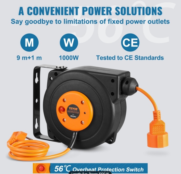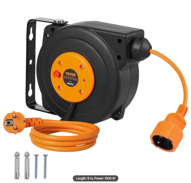 VEVOR ievelkams pagarinātāja vada rullis 9 m, 1000 W + 1m pievads