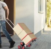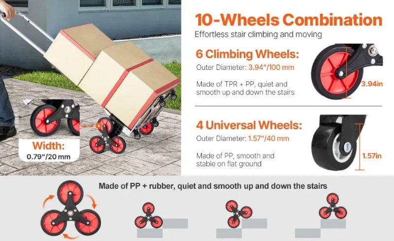 Viegla stumšana: Gatavi mainīt savu skatījumu uz riteņiem! Mūsu kāpņu ratiņiem ir 6 izturīgi plastmasas kāpšanas riteņi (3,94 collu ārējais diametrs) un 4 PP universālie riteņi (1,57 collu ārējais diametrs), kas atvieglo preču pārvadāšanu gan augšup, gan lejup pa kāpnēm, gan uz zemes. Tie ir jūsu izvēle vienmērīgai manevrēšanai uz jebkuras virsmas — zāles, ķieģeļiem, betona un kāpnēm (bet ne uz dobām koka virsmām).