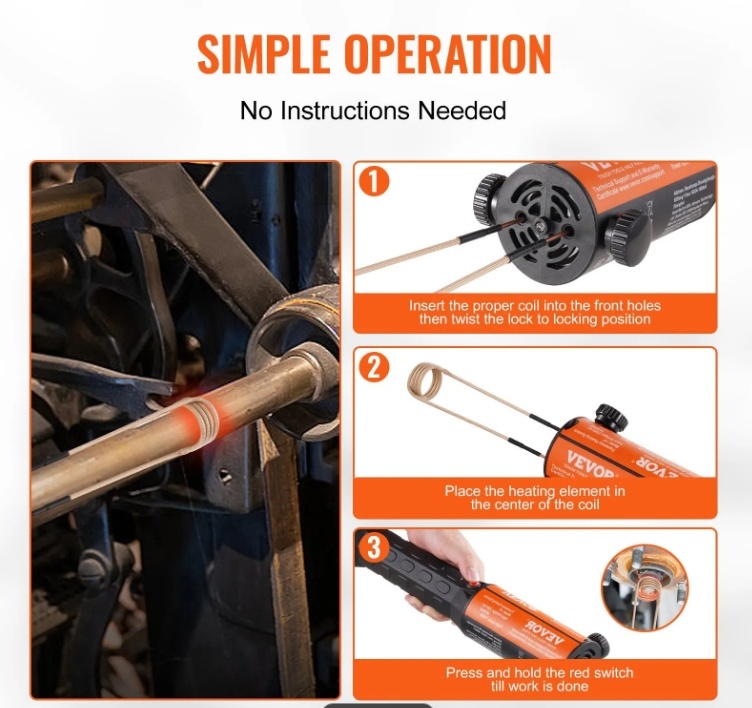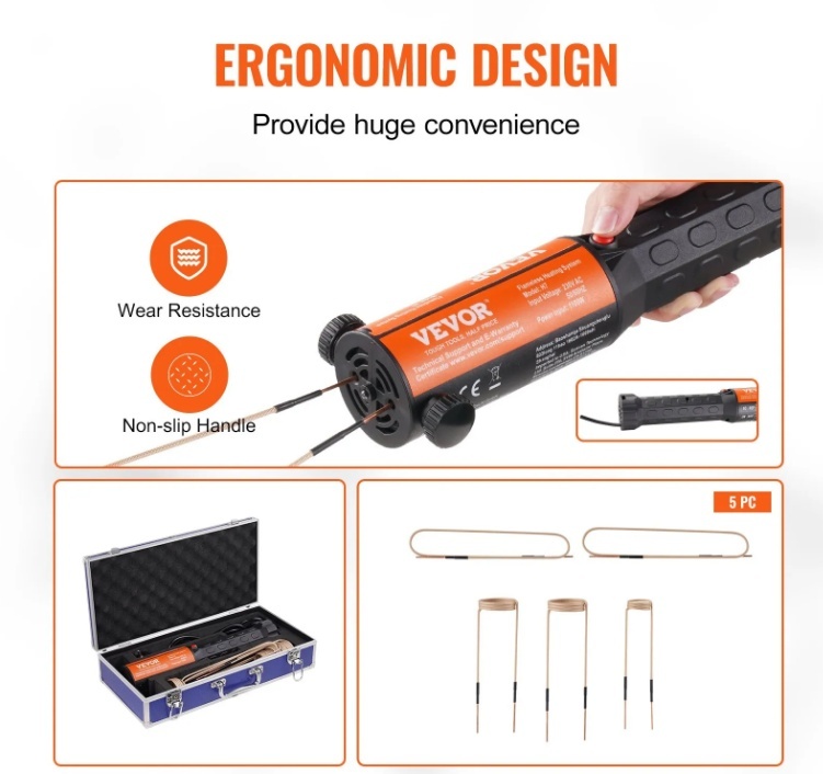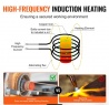 Bezliesmas sildīšana: Šis rokas indukcijas sildītājs izmanto augstfrekvences elektromagnētiskos laukus, lai ātri uzsildītu metālu. Tas nerada liesmas, neprasa ūdens dzesēšanu un ir pilnīgi drošs lietošanā. Salīdzinot ar oksi-acetilēna sistēmām, šī metode ir ātrāka, precīzāka un efektīvāka, padarot to ideāli piemērotu ātriem un precīziem sildīšanas uzdevumiem.