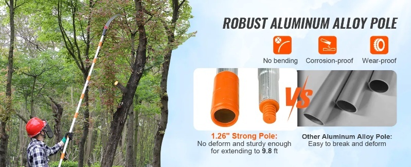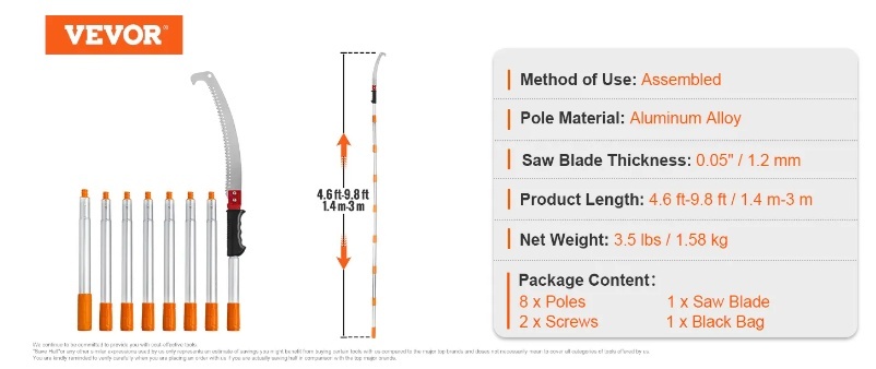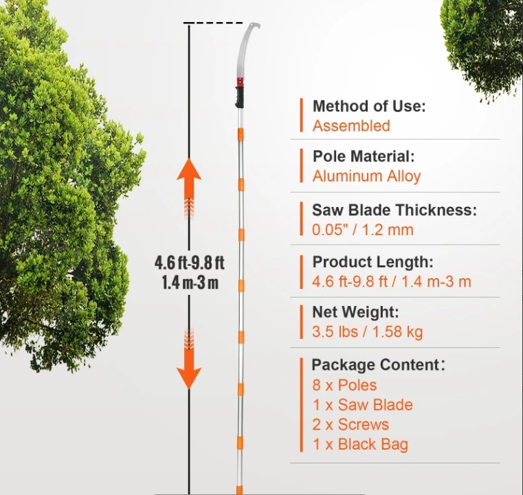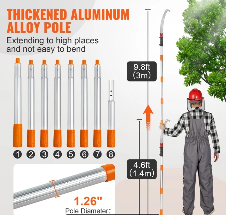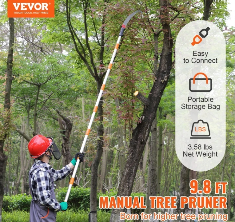 VEVOR manuālais kātu zāģis ir pagarināms. Tas nodrošina daudzpusīgu sniedzamību dažādiem uzdevumiem. To var pagarināt līdz 9,8 pēdām, tādējādi atvieglojot augstu zaru sasniegšanu. Šī funkcija novērš nepieciešamību pēc kāpnēm vai cita aprīkojuma. Garumu var pielāgot savām vajadzībām. Tātad tas ir piemērots arī dažādiem atzarošanas uzdevumiem. Pagarināmība arī atvieglo uzglabāšanu. Piemēram, to var saīsināt kompaktai uzglabāšanai. Visa šī daudzpusība padara to par noderīgu instrumentu ikvienam, kam regulāri jāapgriež koki.