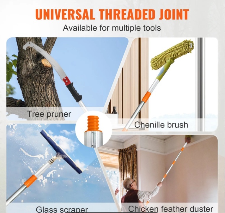 Plašs pielietojums: Mūsu pagarinātajam kāta koku trimmerim ir standarta vītņots savienojums, kas atvieglo montāžu. To var izmantot dažādiem uzdevumiem, kuriem nepieciešams pagarinātājs, piemēram, savienošanai ar šenila otu, krāsas rullīti, skrāpi, griestu ventilatora putekļu slotiņu vai spalvu putekļu slotiņu.