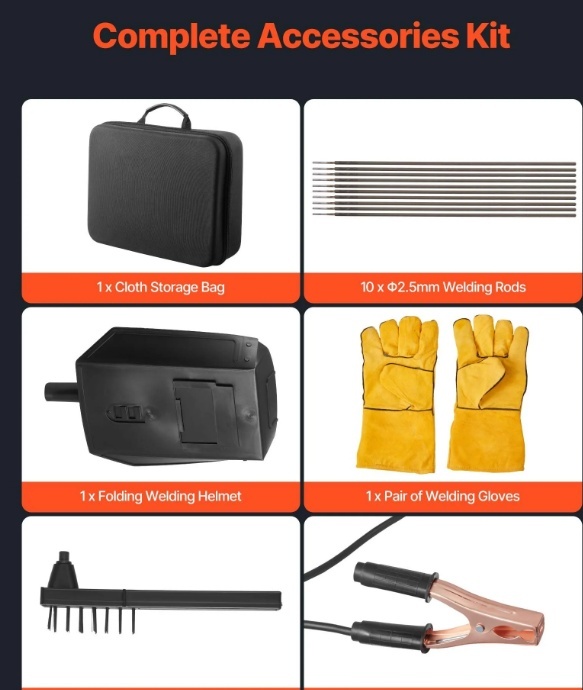 Viss vienā metināšanas komplekts: ietver 1 auduma uzglabāšanas somu, 10 gab. Φ2,5 mm metināšanas stieņus, 1 salokāmu metināšanas ķiveri, 1 metināšanas cimdu pāri, 1 metināšanas birsti un 1 metināšanas zemējuma vadu (1,5 m). Lieliski piemērots inženiertehniskajai metināšanai, automobiļu remontam, mājas “dari pats” projektiem un mašīnbūves ražošanai.