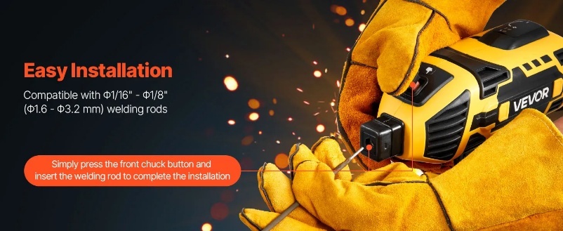 Šī pārnēsājamā metināšanas iekārta ir saderīga ar 1,6 mm līdz 3,2 mm metināšanas stieņiem. Vienkārši nospiediet priekšējās patronas pogu, ievietojiet stieni un sāciet metināšanu — papildu instrumenti nav nepieciešami.