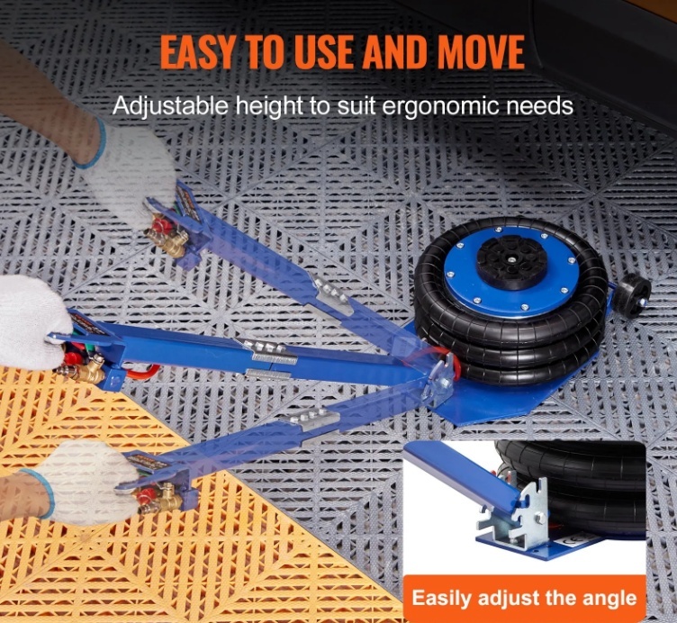 Vienkārša darbība: Ergonomiskam dizainam ir regulējams garš rokturis un divi riteņi ērtai manevrētspējai. Varat regulēt roktura leņķi ērtai darbībai, ļaujot novietot gaisa spilvenu domkratu zem transportlīdzekļa, nenoslogojot muguru. Vārsti atrodas uz roktura efektīvai pacelšanai, un, vienkārši pievienojot gaisa kompresoru un darbinot vārstu, mūsu gaisa spilvenu domkratu var pacelt tikai 5 sekundēs.