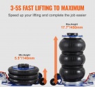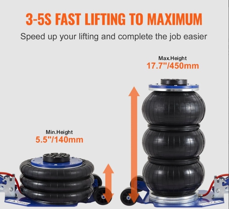 Daudzpusīgs pacelšanas diapazons: Izbaudiet brīvību strādāt ar dažāda augstuma transportlīdzekļiem. Mūsu gaisa spilvenu domkrats lepojas ar pacelšanas augstuma diapazonu no 5,5 līdz 17,7 collām (140–450 mm), nodrošinot, ka tas lieliski pielāgojas jūsu apkopes vajadzībām. Izbaudiet bezrūpīgus remonta un apkopes darbus ar šo ērto funkciju.