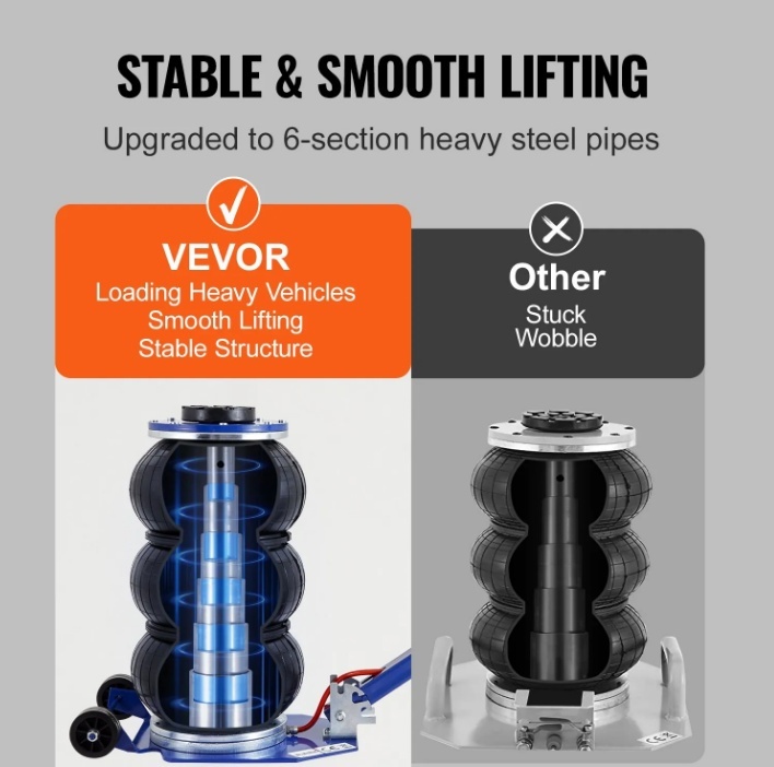 Vienmērīga un uzticama darbība: Atvadieties no kaitinošiem sastrēgumiem! Drošības spilvena domkrats izmanto sešas tērauda caurules, kas ir stratēģiski optimizētas augstumam un konstrukcijai. Šis zinātniskais dizaina uzlabojums nodrošina izcilu stabilitāti pat smagu transportlīdzekļu celšanā. Izbaudiet nemanāmu celšanu bez jebkādiem kaitinošiem šķēršļiem.