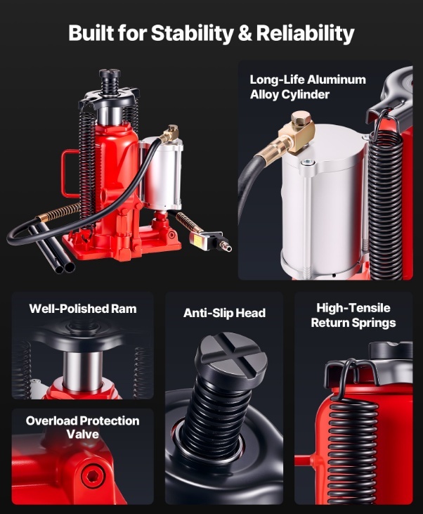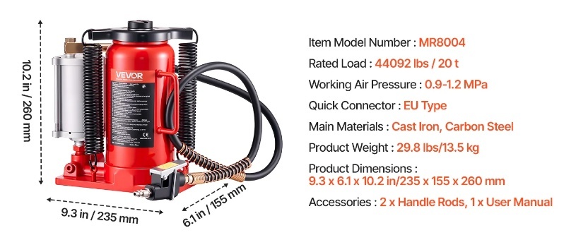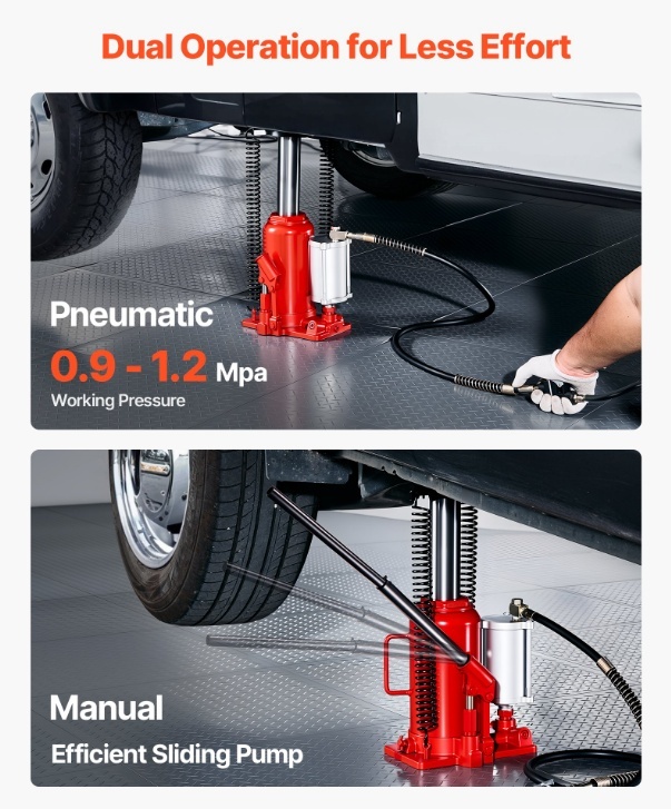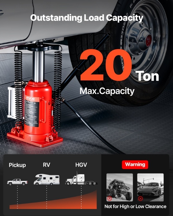 Šis manuālais un pneimatiskais hidrauliskais domkrats izmanto hidraulisko spēku, lai stabili paceltu līdz 20 tonnām. Tas tiek galā ar smagiem darbiem, piemēram, transportlīdzekļu remontu vai mājas apkopi ar kravas automašīnām, kemperiem, pikapiem un apvidus auto.