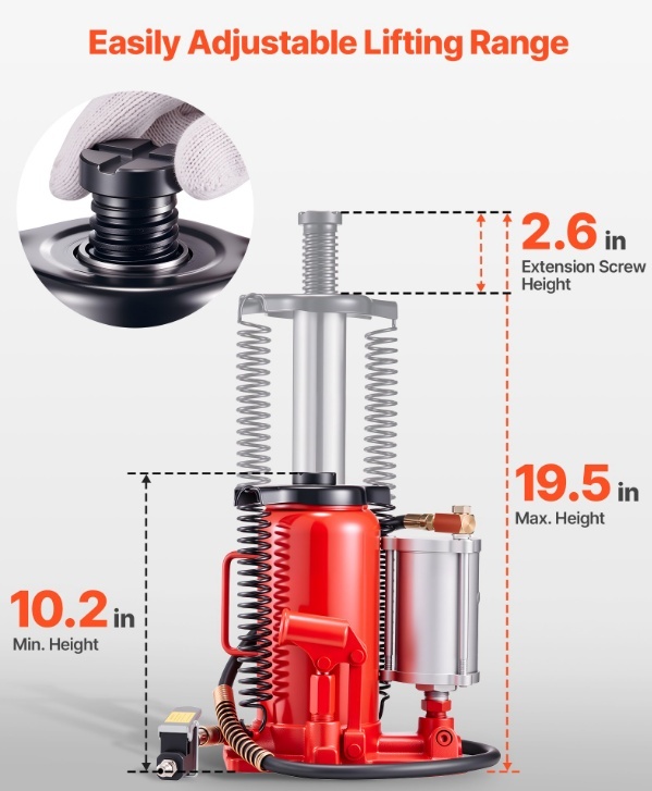 VEVOR pneimatiskais hidrauliskais domkrats ar augstu pacelšanas augstumu, 20 tonnas