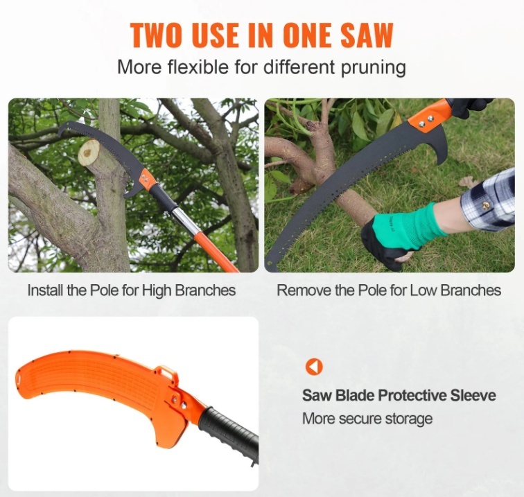 Drošs un stabils: Ērtais rokturis un kāta savienojumi ir izgatavoti no izolācijas materiāla, kas nodrošina drošību lietošanas laikā. Turklāt pastiprinātas skrūves uztur stabilitāti starp zāģi un kātu, novēršot to atslābšanu un iespējamus savainojumus.