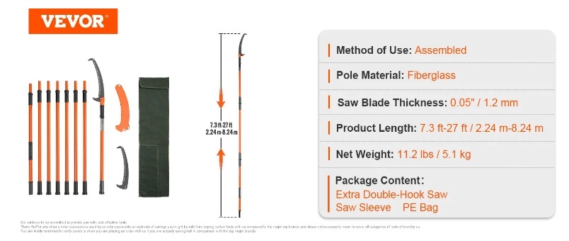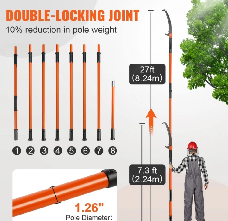 Grieziet augstu vai zemu: Vai esat gatavs veikt jebkuru darbu? Šo manuālo kātu zāģi var noregulēt dažādos augstumos ar tā 8 kātiem, sākot no 7,3 līdz 27 pēdām (2,24 m līdz 8,24 m). Tas ir paredzēts augstu zaru apgriešanai, bet to var izmantot arī kā rokas zāģi zemāku zaru, krūmu un baļķu apgriešanai.