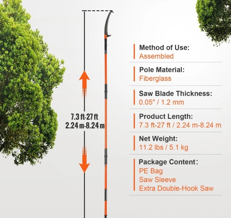 VEVOR izvelkamais kātzāģis ir izstrādāts, lai māju īpašnieki varētu apgriezt augstu koku zarus, neuzņemoties lielu risku, kāpjot pa kāpnēm. Šis koku griezējs izvelkams no 2,1 līdz 7,2 metriem, kas atvieglo un padara garu koku apgriešanu vienkāršāku un drošāku.