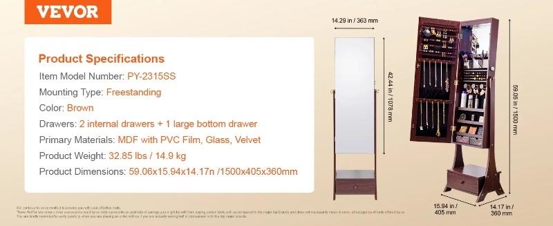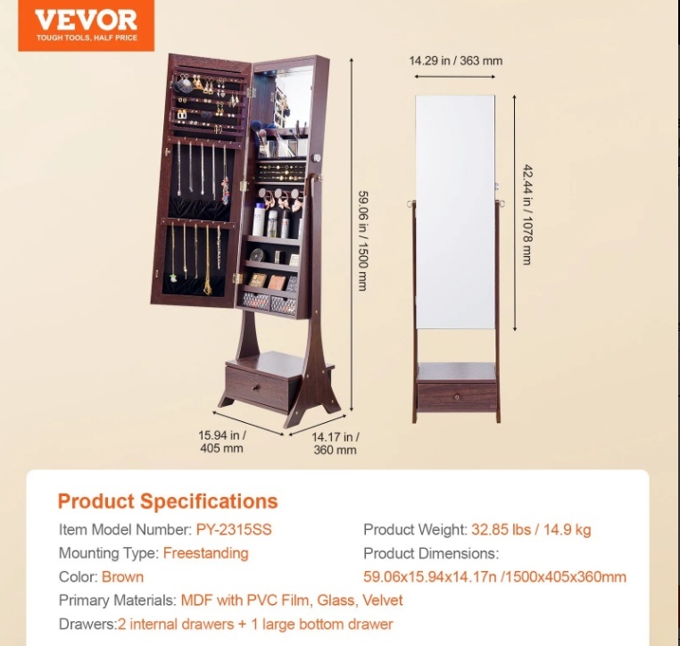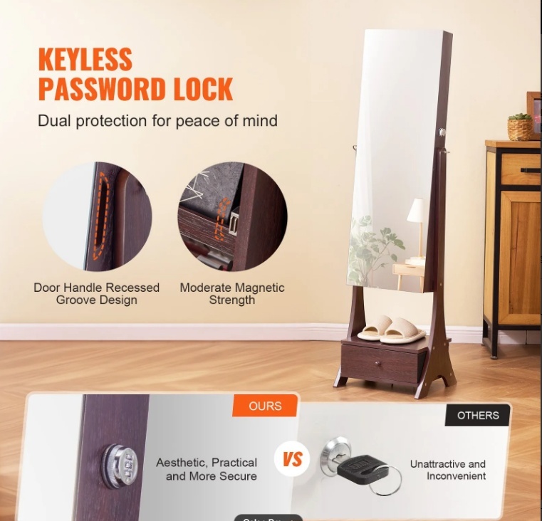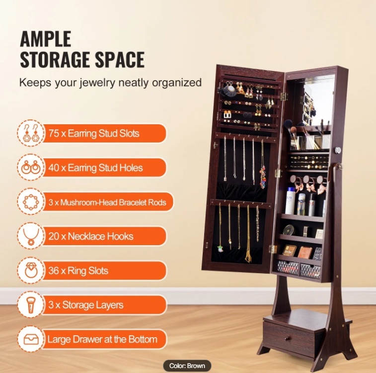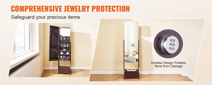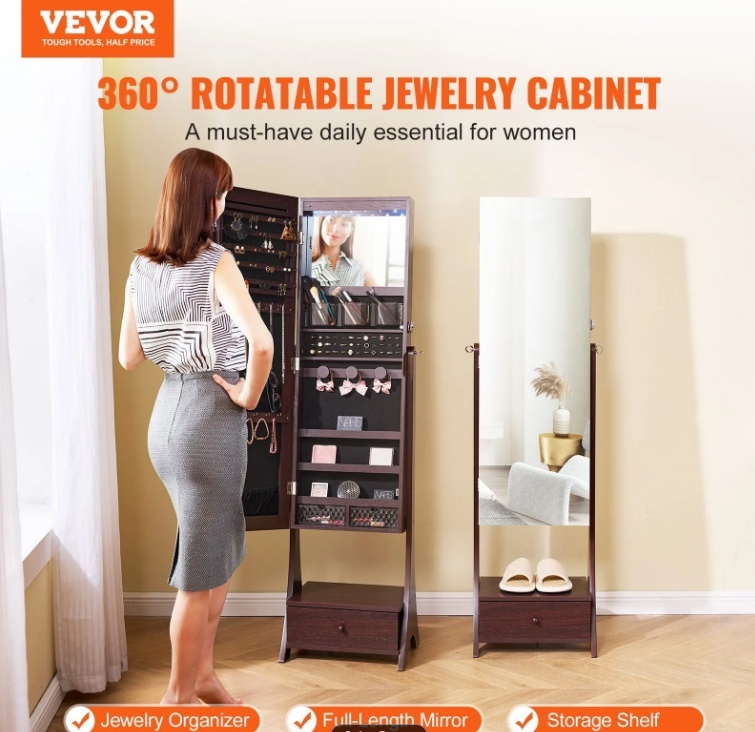 3 vienā funkcionalitāte: VEVOR stāvspogulis ar uzglabāšanas vietu ir ne tikai rotaslietu organizators, bet arī pilna auguma spogulis, kas nodrošina skatu uz jūsu tērpu no galvas līdz kājām. Tam ir liela, salokāma uzglabāšanas atvilktne un plaukti, padarot to par nepieciešamu ikdienas priekšmetu katrai meitenei.