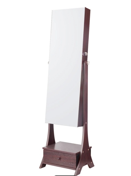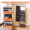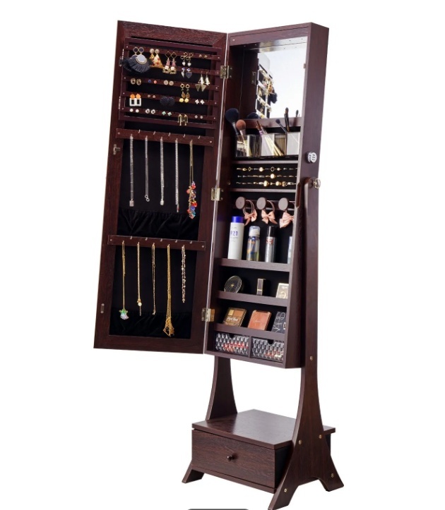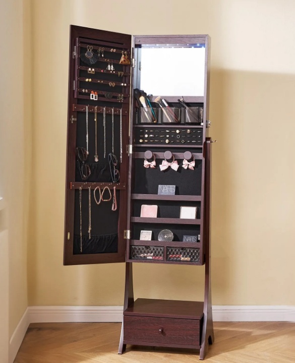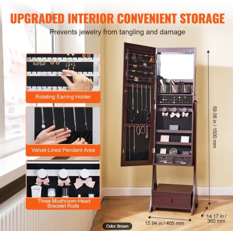 Spoguļa rotaslietu skapis, stāvošs spogulis ar uzglabāšanas vietu, slēdzams rotaslietu spoguļu organizators ar pilna garuma spoguli, samta odere, iekšējais LED apgaismojums, atvilktne, brīvi stāvošs rotaslietu skapis, brūns