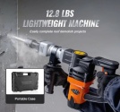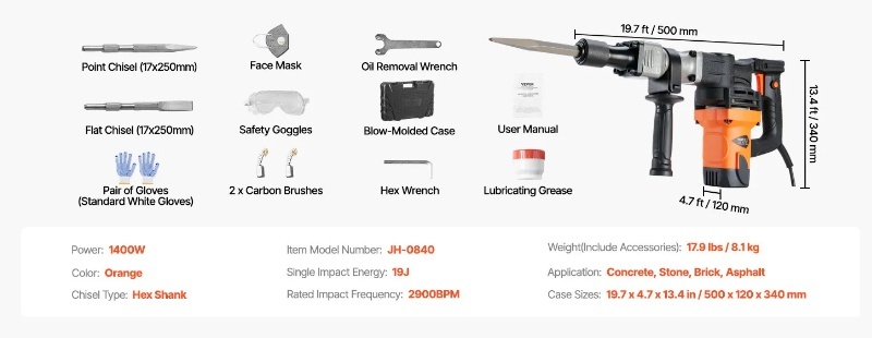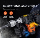 Saglabā vēsumu intensīva darba laikā: Efektīvā dzesēšanas sistēma efektīvi atdzesē motoru, lai uzlabotu betona āmura kalpošanas laiku. Dzinējs saglabās zemu temperatūru pat pēc smagas darba dienas! Plašs pielietojumu klāsts: 110 V jaudas demontāžas urbjmašīnas un āmuri ir aprīkoti ar 2 kaltiem (plakano kaltu un smailo kaltu). Tas ir ideāli piemērots demontāžai, tranšeju rakšanai, šķelšanai un caurumu veidošanai betonā, blokos, ķieģeļos un flīzēs. Tas ir ideāli piemērots arī dažādiem pielietojumiem, piemēram, cauruļvadiem, mehāniskajai instalācijai, drenāžas iekārtu būvniecībai, iekštelpu dekorēšanai un daudz kam citam!
