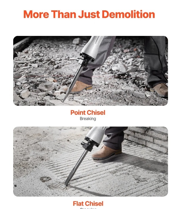 Plašs pielietojumu klāsts: 110 V jaudas demontāžas urbjmašīnas un āmuri ir aprīkoti ar 2 kaltiem (plakano kaltu un smailo kaltu). Tas ir ideāli piemērots demontāžai, tranšeju rakšanai, šķelšanai un caurumu veidošanai betonā, blokos, ķieģeļos un flīzēs. Tas ir ideāli piemērots arī dažādiem pielietojumiem, piemēram, cauruļvadiem, mehāniskai uzstādīšanai, drenāžas iekārtu būvniecībai, māju pamatu nojaukšanai, betona plātnēm, eļļas skursteņiem, iekštelpu apdarei un daudz kam citam!