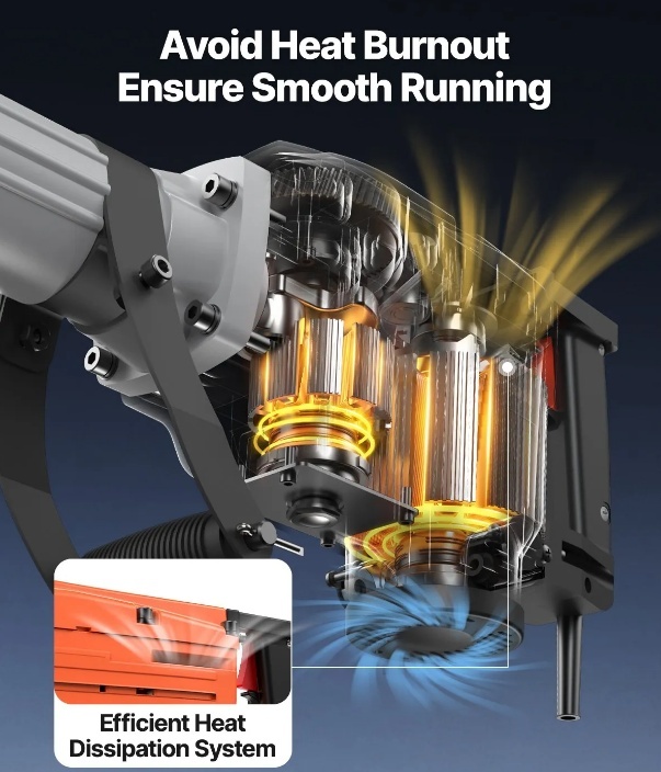 Saglabā vēsumu intensīva darba laikā: Efektīvā dzesēšanas sistēma efektīvi atdzesē motoru, lai uzlabotu betona āmura kalpošanas laiku. Dzinējs saglabās zemu temperatūru pat pēc ilga darba laika.