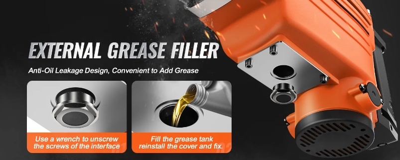 Nomierinoša pieredze: Augstas izturības sakausējuma patrona var izturēt spēcīgus demontāžas triecienus. Skaldāmā āmura patrona ir ātri saliekama un demontējama. Kaltu ir viegli nomainīt, un tas nekad nejauši nenokritīs pēc nostiprināšanas. Rokturis ir izgatavots no plastmasas, lai izvairītos no elektriskās strāvas trieciena riska.