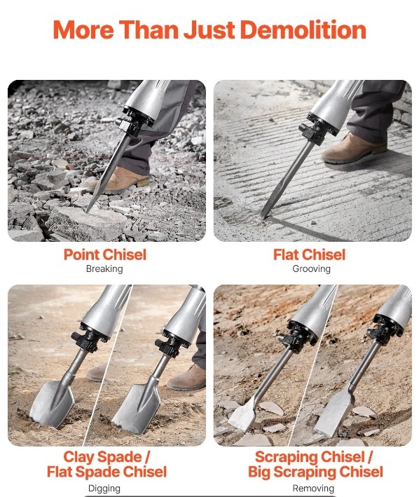 Plašs pielietojumu klāsts: 110 V jaudas demontāžas urbjmašīnas un āmuri ir aprīkoti ar 6 kaltiem (smailu kaltu, plakanu kaltu, māla lāpstas kaltu, plakanu lāpstas kaltu, skrāpēšanas kaltu un lielu skrāpēšanas kaltu). Tas ir lieliski piemērots demontāžai, tranšeju rakšanai, šķelšanai un caurumu veidošanai betonā, blokos, ķieģeļos un flīzēs. Tas ir ideāli piemērots arī dažādiem pielietojumiem, piemēram, cauruļvadiem, mehāniskai uzstādīšanai, drenāžas iekārtu būvniecībai, māju pamatu nojaukšanai, betona plātnēm, eļļas skursteņiem, iekštelpu apdarei un daudz kam citam!