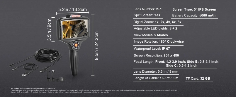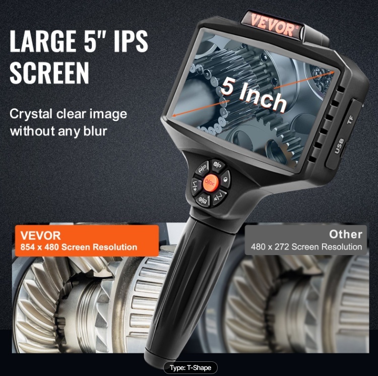 VEVOR trīskāršā objektīva industriālajam endoskopam ir pieci dažādi skata leņķi. Tas nozīmē, ka varat apskatīt un analizēt zonu, izmantojot dažādus skatus. Šim endoskopam ir arī 10 gaismas: 8 ap galveno kameru un divas papildu gaismas. Šīs gaismas nodrošina pietiekamu apgaismojumu, lai apgaismotu zonu un pareizi pārbaudītu problēmas.