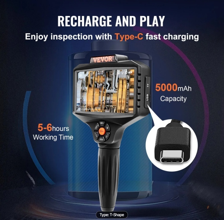 VEVOR cauruļu pārbaudes kamerai ir 5000 mAh akumulators. Šis akumulators ļauj tai darboties 5 līdz 6 stundas nepārtraukti. Kad esat ilgstoši lietojis šo endoskopu, uzlādējiet to, izmantojot USB lādētāju. Lietotājam draudzīgs endoskops palīdz ātrāk veikt uzdevumu, neprasot plašu apmācību.