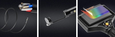 【Trīskāršais objektīvs plašākam skata laukam】Šim trīs objektīvu endoskopam ir viena kamera priekšpusē un divas sānos, kas ļauj pārbaudīt zonu no dažādiem leņķiem. Tas var vienlaikus attēlot priekšējo un sānu skatu dalītā ekrānā detalizētai pārbaudei. Ar kopumā 5 skatīšanās režīmiem endoskops nodrošina plašāku skata lauku un skaidrākus attēlus. 8+2 gaismas ar 3 regulējamiem spilgtuma līmeņiem nodrošina pietiekamu apgaismojumu tumšākām situācijām.