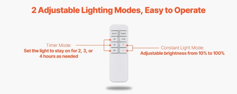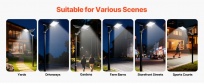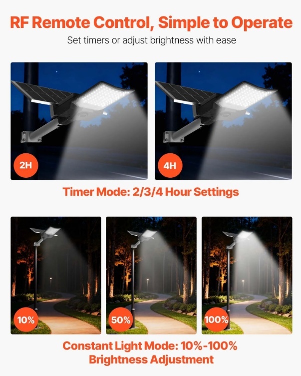 Tālvadības pults un regulēšana: Mūsu LED ielu apgaismojums, ko darbina ar RF tālvadības pulti, piedāvā divus apgaismojuma režīmus. Varat iestatīt taimerus vai aktivizēt pastāvīgu apgaismojuma režīmu. Spilgtumu var regulēt no 10% līdz 100%, lai apmierinātu jūsu dažādās vajadzības.