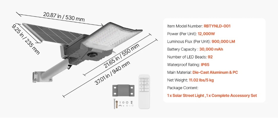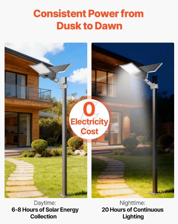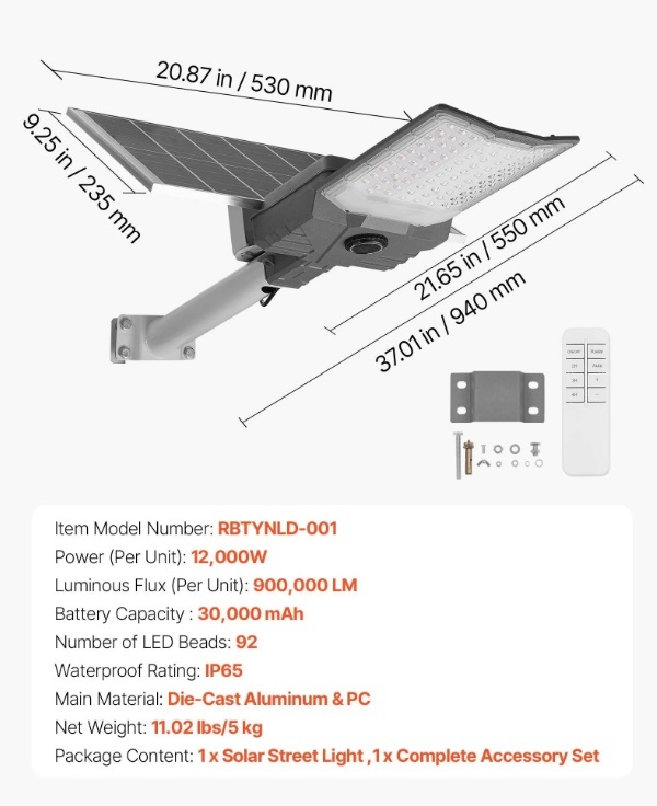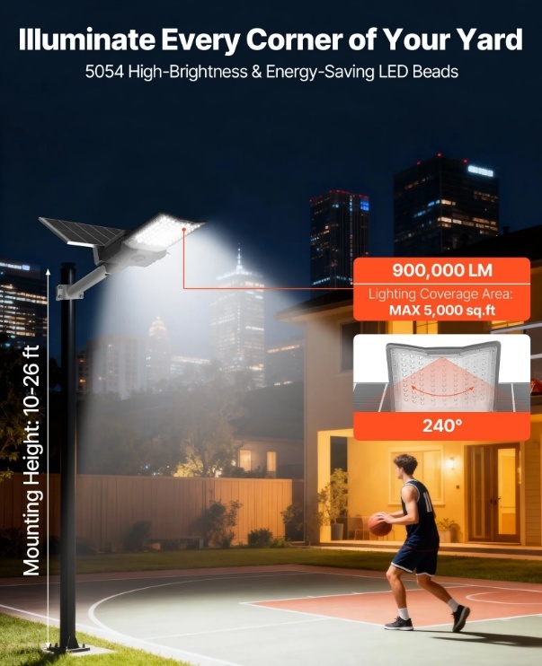 Spilgts saules enerģijas ielu apgaismojums: Šis 12 000 W saules enerģijas ielu apgaismojums, kas paredzēts lietošanai ārā, ir aprīkots ar 5054 spilgtām, enerģiju taupošām LED lodītēm, un tas nodrošina jaudīgu 240° platleņķa staru kūli ar iespaidīgiem 900 000 lūmeniem. Apgaismojiet katru sava pagalma stūri.