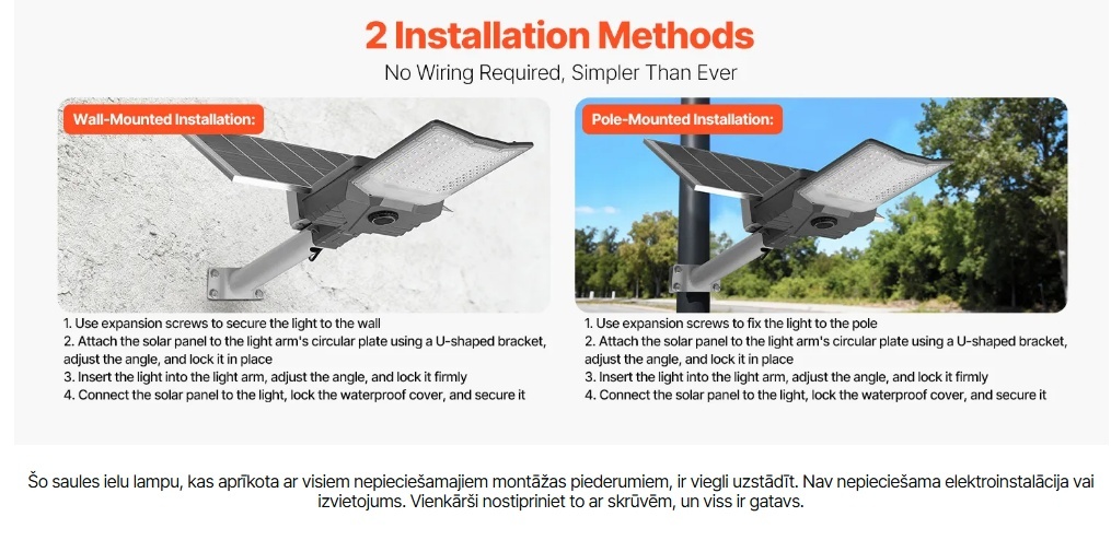 Šo saules ielu lampu, kas aprīkota ar visiem nepieciešamajiem montāžas piederumiem, ir viegli uzstādīt. Nav nepieciešama elektroinstalācija vai izvietojums. Vienkārši nostipriniet to ar skrūvēm, un viss ir gatavs.