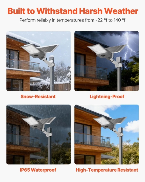 Izturība pret laikapstākļiem: Izgatavots no augstākās kvalitātes materiāla, šis saules ielu apgaismojums nodrošina izturīgu un triecienizturīgu konstrukciju. Ar IP65 ūdensnecaurlaidības pakāpi tas droši darbojas lietū, sniegā un augstā temperatūrā.