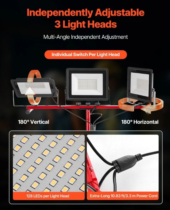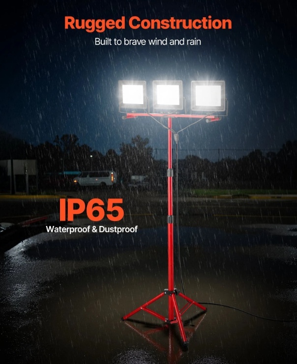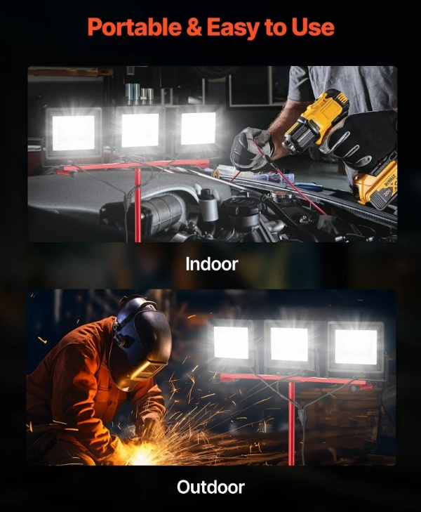Viena lampa, daudzkārtēja lietošana: Šis celtniecības apgaismojums var viegli tikt galā ar tādiem uzdevumiem kā dārza apgaismojums, pagraba remonts, automašīnas apkope, kempings vai būvniecība. Salokāms statīva statīvs un regulējamas lampas galvas nodrošina vairākus pielietojumus