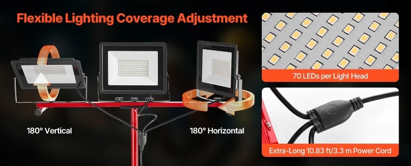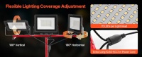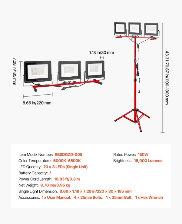 Viena lampa, daudzkārtēja lietošana: Šis celtniecības apgaismojums var viegli tikt galā ar tādiem uzdevumiem kā dārza apgaismojums, pagraba remonts, automašīnas apkope, kempings vai būvniecība. Salokāms statīva statīvs un regulējamas lampas galvas nodrošina vairākus pielietojumus