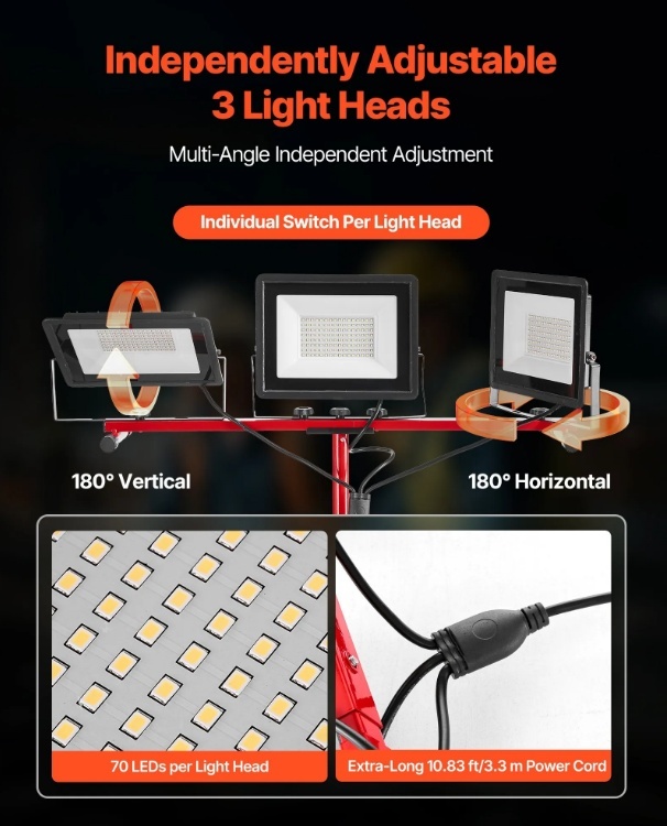 Katru no trim mūsu pārnēsājamā darba apgaismojuma galvām var neatkarīgi pagriezt par 360° un vadīt ar atsevišķiem slēdžiem. Tās ir arī noņemamas, atbalstot dažādas lietošanas metodes, piemēram, stiprināšanu pie sienas un fiksēta punkta apgaismojumu, lai tas atbilstu dažādiem apgaismojuma scenārijiem.