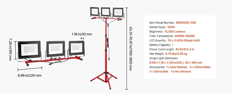 Ļoti elastīgs un regulējams: Šim LED darba lampai ir elastīga augstuma regulēšana no 43,31 collas līdz 70,87 collām, viegli pielāgojoties dažādiem apgaismojuma leņķiem un darba zonām. Trijkājis nodrošina stabilu atbalstu un apgaismojumu uz sarežģītām virsmām.