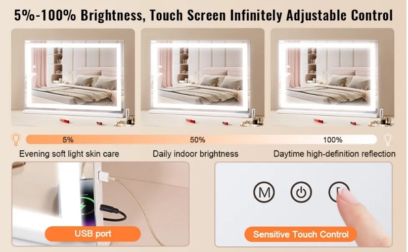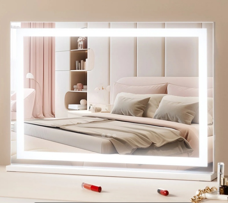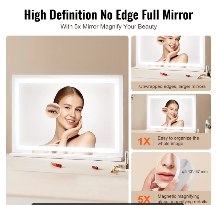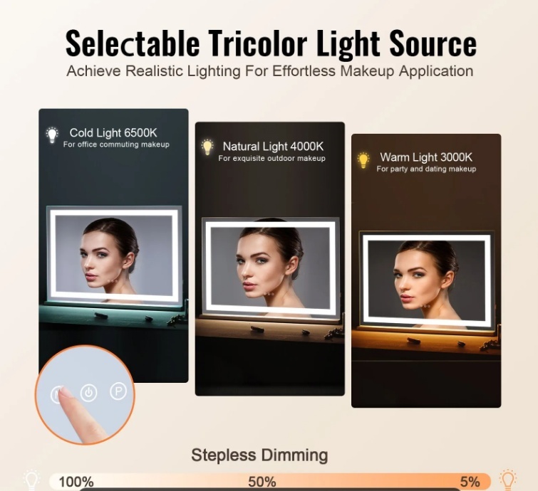 Trīskrāsu gaismas avots: Aprīkots ar aukstu gaismu (6500K), silti baltu (4000K) un siltu gaismu (3000K), vienlaikus nodrošinot trīskrāsu apgaismojumu ar skārienekrānu, kas bezgalīgi regulējams spilgtums, imitējot reālu apkārtējo apgaismojumu dažādās ainās, neatkarīgi no tā, vai tā ir dienas brauciens uz darbu vai vakara ballīte, grima uzklāšana, padarot to viegli lietojamu.