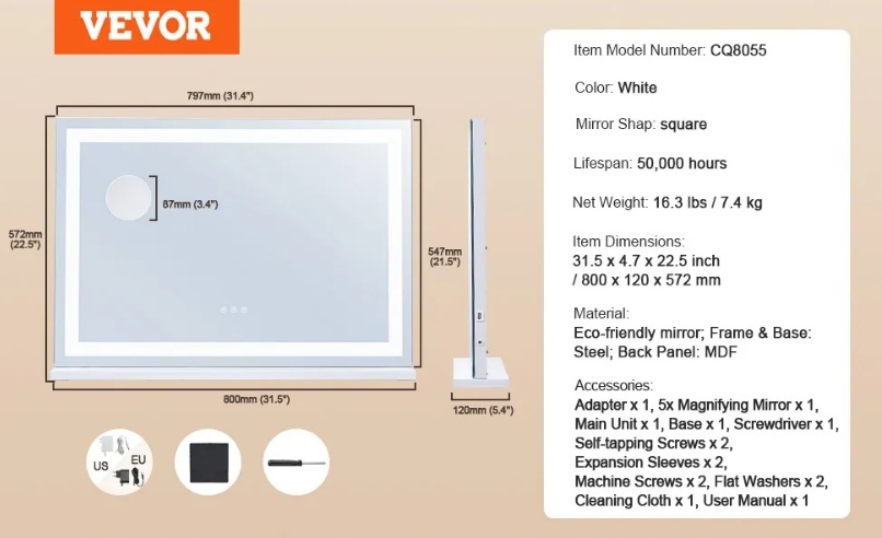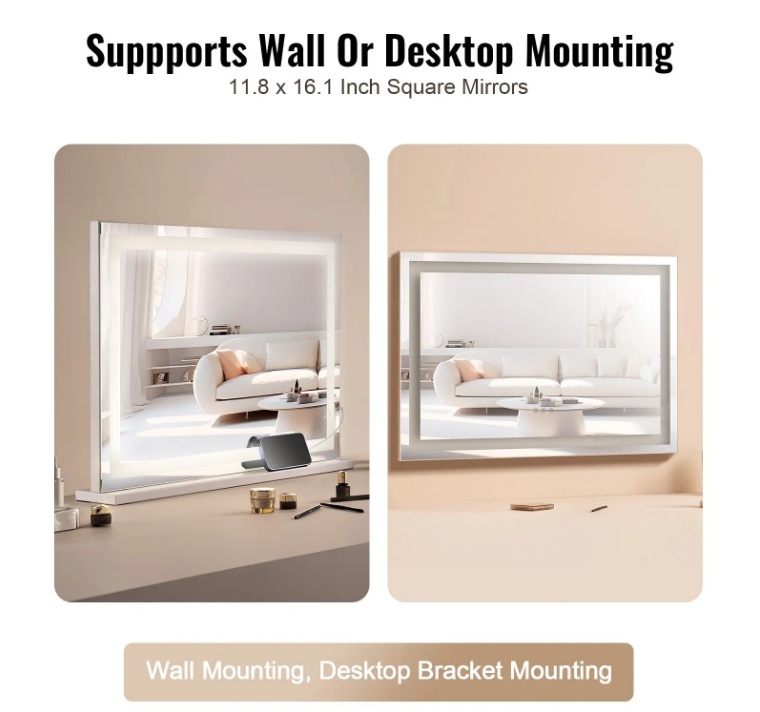 VEVOR Makeup apgaismots kosmētikas spogulis ar 3 krāsu izlietni un USB , galda un stiprinājums pie sienas , 80x55,1 cm