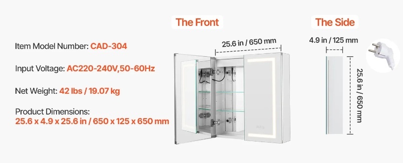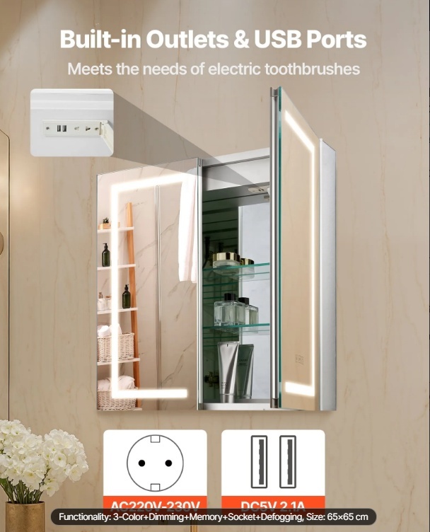Ērta iebūvēta kontaktligzda: Apgaismotais spoguļa zāļu skapītis ir aprīkots ar iebūvētu kontaktligzdu, kurā ir divu veidu kontaktligzdas, kas paredzētas tikai skuvekļu darbināšanai, piedāvājot lielākas ērtības ikdienas lietošanā.