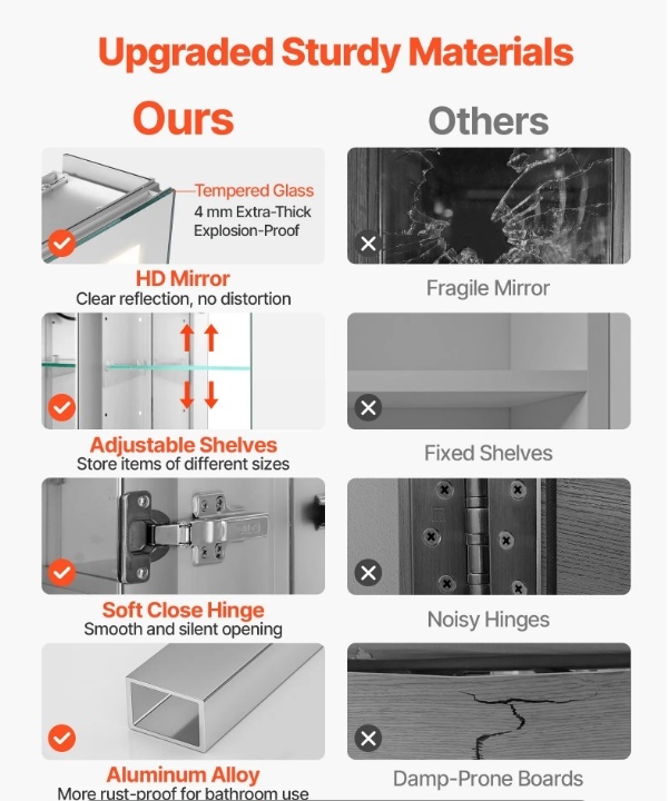 Uzlabota pieredze: Mūsu LED vannas istabas spoguļa zāļu skapītim ir augstas izšķirtspējas spogulis skaidriem, bez kropļojumiem atstarojumiem. Tam ir mīkstas aizvēršanās eņģes vienmērīgai un klusai darbībai un regulējami plaukti dažāda izmēra priekšmetu glabāšanai.