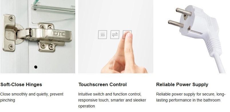 Viena pieskāriena pretmiglošanas funkcija: Ar viena pieskāriena pretmiglošanas funkciju LED spoguļskapītis ātri uzsilda spoguļa centru, lai novērstu miglošanos, nodrošinot skaidru atstarošanos pat mitros vannas istabas apstākļos.