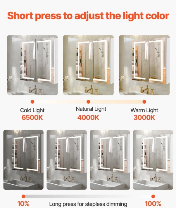 Spilgtums un 3 krāsu temperatūras: Mūsu apgaismotais vannas istabas spoguļskapītis piedāvā pakāpenisku aptumšošanu un 3 krāsu temperatūras, kas ir ideāli piemērotas grima uzklāšanai vai lietošanai vājā apgaismojumā naktī. Tas arī automātiski atceras pēdējo spilgtuma iestatījumu.