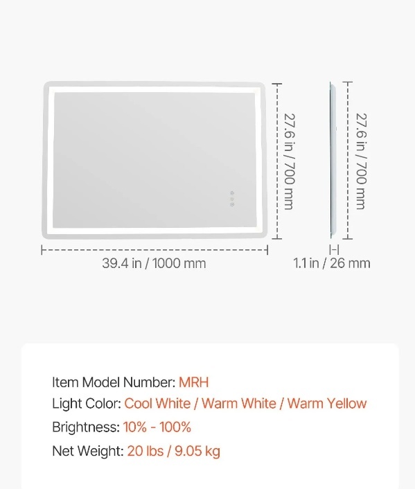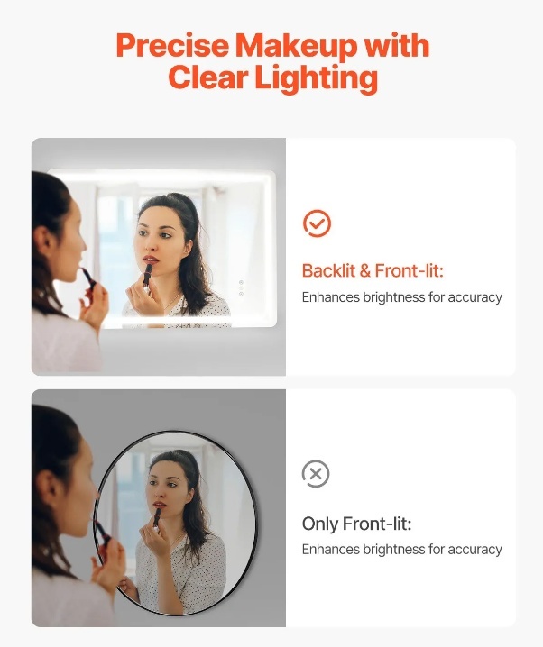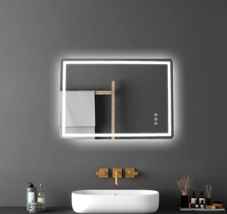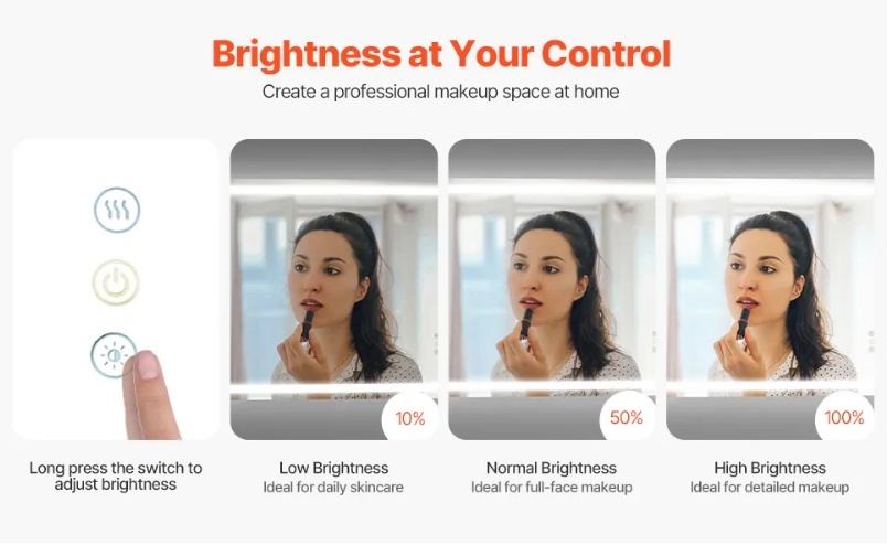 Regulējams LED apgaismojums un atmiņas funkcija: Šim LED vannas istabas spogulim ir viedas skārienvadības ierīces, lai pārslēgtos starp trim krāsu temperatūrām — silti dzeltenu (3000 K), silti baltu (3000 K) un vēsi baltu (6000 K) — un tas piedāvā nemanāmu spilgtuma regulēšanu no 10% līdz 100%. Atmiņas funkcija saglabā jūsu pēdējos iestatījumus, nodrošinot precīzu apgaismojumu nākamajai lietošanas reizei bez nepieciešamības tos atkārtoti regulēt.