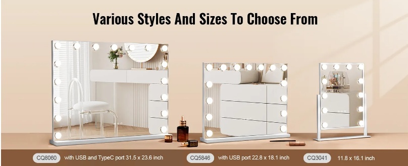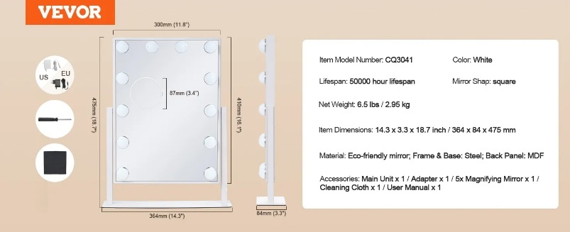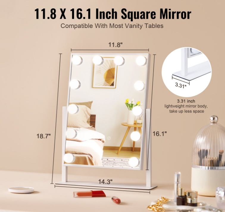 Plāns un viegls: Mūsu kvadrātveida spoguļi ir saderīgi ar lielāko daļu kumožu, spoguļa virsma ir plakana un bez kropļojumiem, un plānais spoguļa korpuss ar tērauda rāmi padara visu kumodes skapi smalkāku, un tā kalpošanas laiks ir 50 000 stundas. Plakans un stabils: mūsu kosmētikas spoguļi atstaro lokus bez kropļojumiem, precīzi atjaunojot jūsu skaistumu. Jūsu drošībai tas ir aprīkots arī ar oglekļa rāmi un sprādziendrošu stiklu. Šis produkts neatbalsta uzlādi, tas ir jāpievieno strāvas avotam, lai to lietotu.