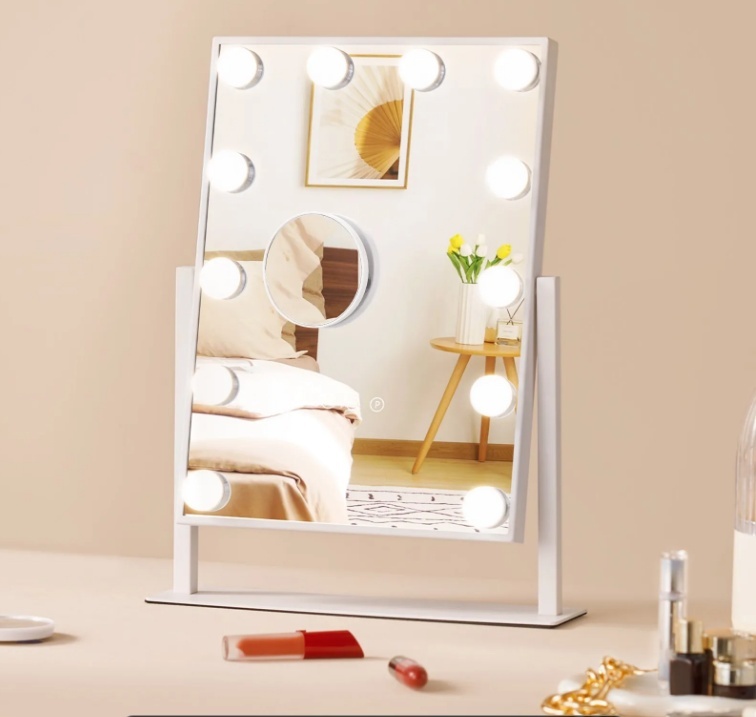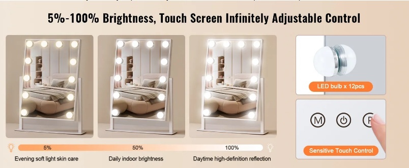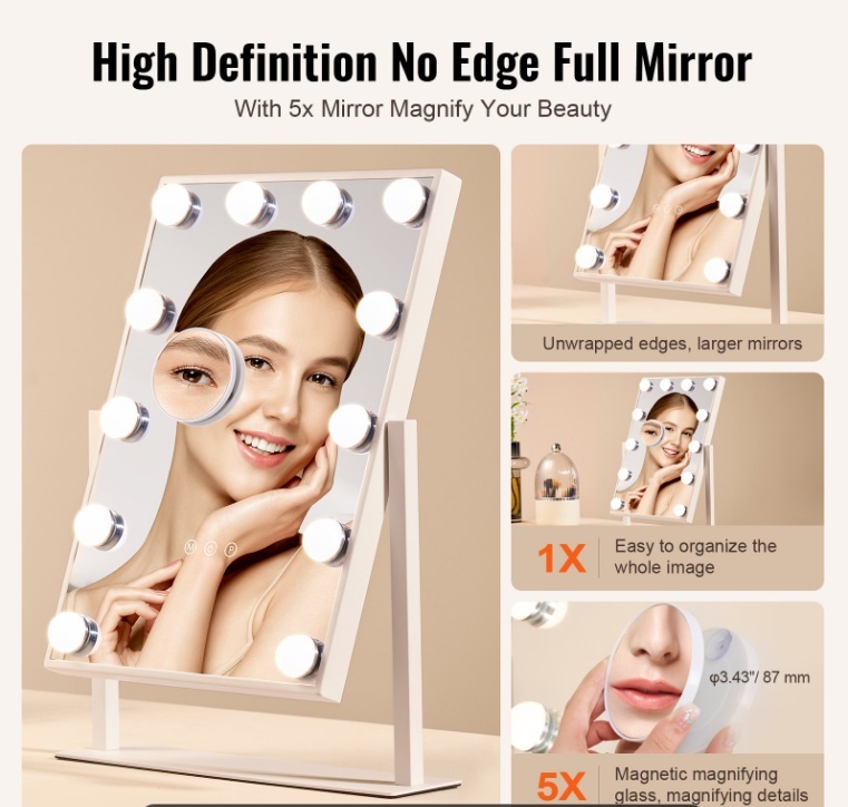 VEVOR Makeup spogulis ar gaismām , 12 regulējamām spuldzēm un 3 krāsu apgaismojuma režīmiem , noņemamu 5x palielinājumu un viedu skārienvadību