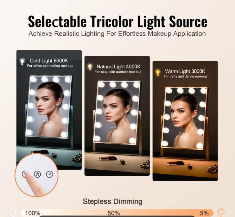 Trīskrāsu gaismas avots: Aprīkots ar aukstu gaismu (6500K), silti baltu gaismu (4000K) un siltu gaismu (3000K) ar trīskrāsu apgaismojumu vienlaikus ar skārienekrānu un bezgalīgi regulējamu spilgtumu, kas imitē reālu apkārtējo apgaismojumu dažādās ainās, neatkarīgi no tā, vai tā ir dienas brauciens uz darbu vai vakara ballītes grims, padarot to viegli lietojamu.