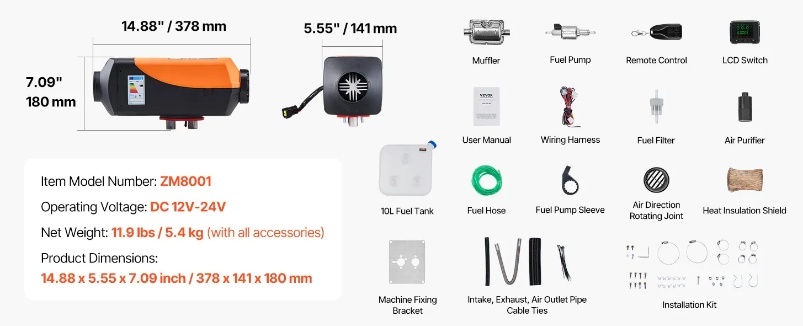 Efektīva sildīšana: Šis 8 kW dīzeļdegvielas sildītājs darbojas ar 12 V–24 V līdzstrāvu un ir piemērots platībām no 161 līdz 215 pēdām (apmēram 56–94 m²). Keramikas aizdedzinātājs nodrošina ātru iedarbināšanu aukstā laikā, paaugstinot temperatūru jūsu transportlīdzeklī, kemperī, laivā un citur.