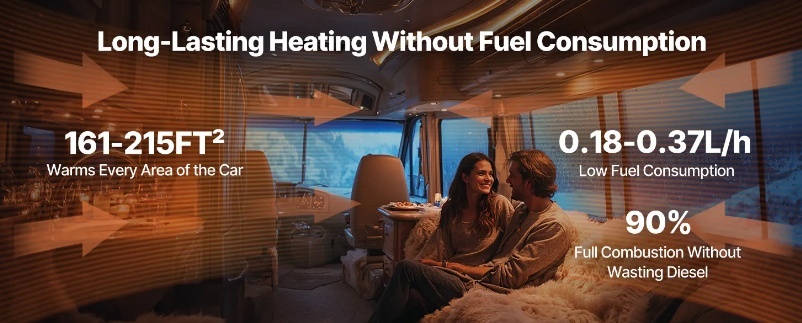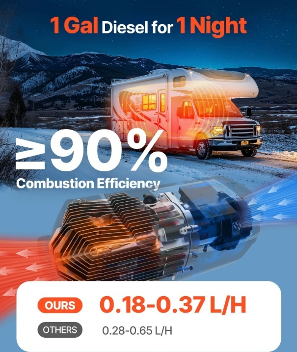 Nav jāuztraucas par pārmērīgu degvielas patēriņu garu braucienu laikā ar kemperi. Mūsu dīzeļdegvielas gaisa sildītājam ir iespaidīga degvielas efektivitāte ≥90%, nodrošinot, ka katrs dīzeļdegvielas piliens tiek pilnībā izmantots. Visai nakts apkurei nepieciešams tikai 1 galons dīzeļdegvielas.