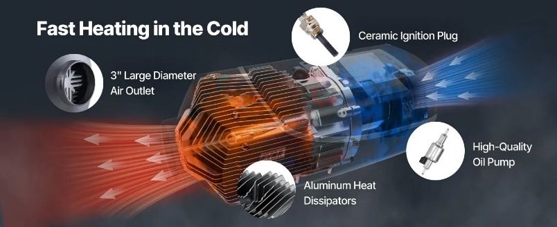Plaša pielietojuma joma: dīzeļdegvielas stāvvietas sildītājs efektīvi darbojas augstumā zem 9843 pēdām. Kompakts un viegli uzstādāms, tas nodrošina nepārtrauktu siltumu lielā augstumā vai aukstā vidē, garantējot komfortu neatkarīgi no jūsu atrašanās vietas.