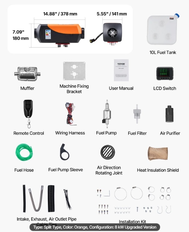 VEVOR 8 kW DC12-24V, ātri uzsildāms dīzeļa sildītājs ar tālvadības pulti un krāsu digitālo displeju, 10L degvielas tvertne