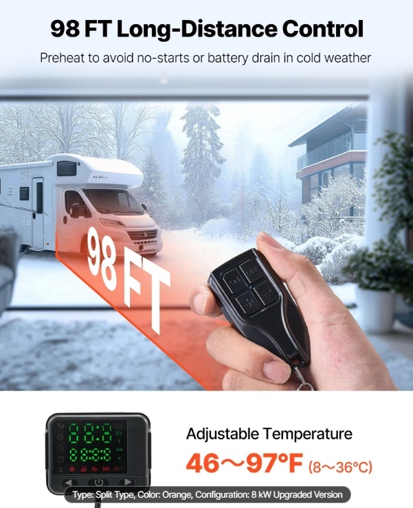 Divkāršas vadības iespējas: Pārnēsājamajam dīzeļdegvielas sildītājam ir 98 pēdu (apmēram 27 m) tālvadības pults priekšsildīšanai no transportlīdzekļa ārpuses, uzturot salonu siltu un novēršot salu. LCD ekrāns ļauj regulēt temperatūru no 46 līdz 97 ℉ atbilstoši jūsu vajadzībām.